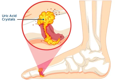 Gout (yaani arthritis ya metabolic) hutokea kutokana na uzalishaji mwingi wa asidi ya uriki mwilini, au kukosekana kwa uwezo wa kuiondoa asidi hiyo, jambo linalosababisha kuongezeka kwa kiwango cha asidi ya uriki kwenye damu. Hali hii hujulikana kama hyperuricemia na husababisha maradhi ya arthritis ya gout, ambayo mara nyingi huathiri viungo vya kidole kikubwa cha mguu, pamoja na mikono, magoti, viwiko, na sehemu nyinginezo.